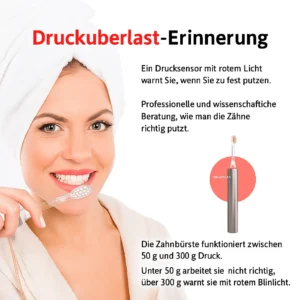 Sobald der Druck über 300 g steigt, aktiviert sich ein dezentes rotes Warnlicht, das Ihr Zahnfleisch schützt und eine gesunde Putzgewohnheit fördert.